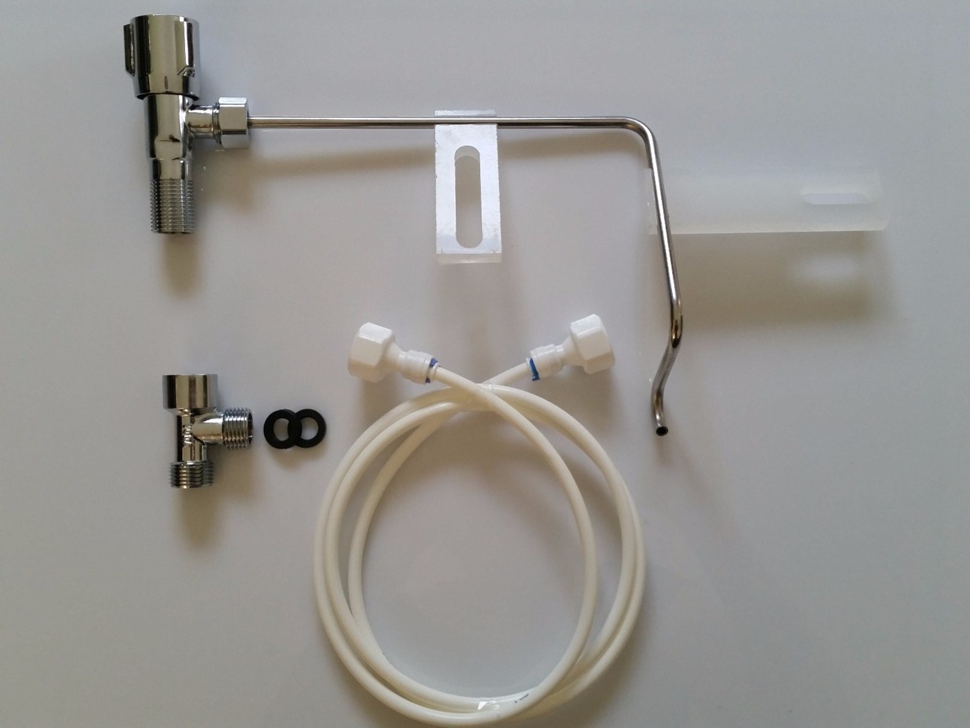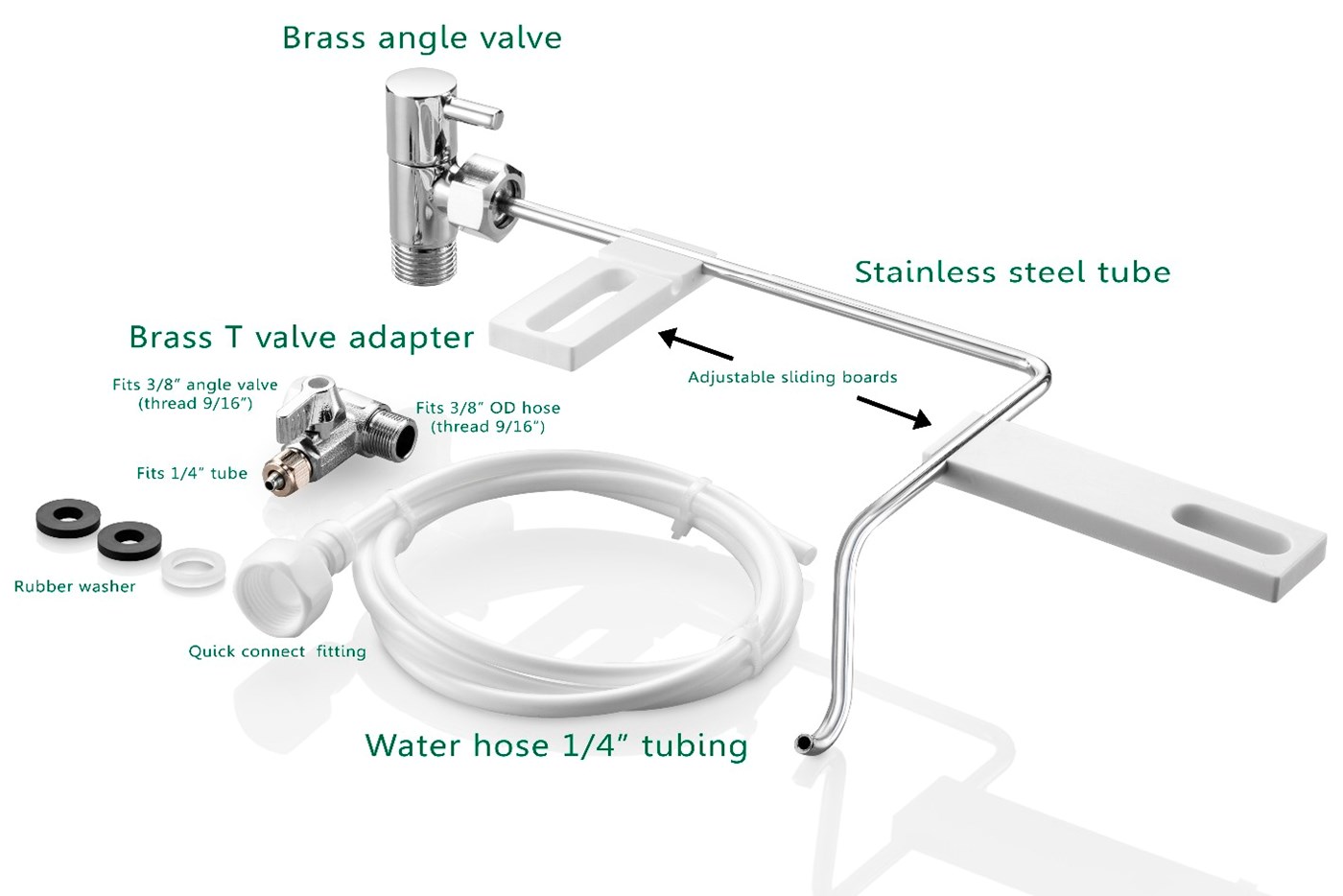 Plastic latch – installation base Mirror stainless steel tube ** High quality brass valve Water supply hose 1/4" – length can be adjustable. Plastic connectors 1/2" High quality brass Tee Seals |